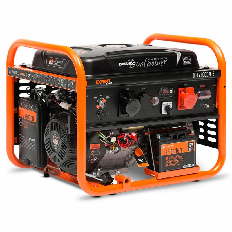 Бензиновий генератор Daewoo GDA 7500DPE-3 з технологією Dual Power виділяється з багатьох трифазних мініелектростанцій, здатних забезпечувати не більше 30% потужності для однофазних споживачів. Завдяки новій конструкції альтернатора пристрій дозволяє видавати однаково високу потужність у двох режимах – 380 В та 220 В. На панелі керування розташований селектор, за допомогою якого можна легко змінювати режим роботи електрогенератора. Альтернатор, на 100% виконаний з міді, забезпечує вироблення стабілізованого струму, має високий ККД, а також хорошу тепловіддачу. А це потрібно для тривалої безперервної роботи. Також цей тип альтернатив дозволяє підключати до генераторних установок інверторні зварювальні апарати. Великий паливний бак із системою індикації рівня палива збільшує час роботи генератора без дозаправки на 20%. Особливістю та перевагою бака для палива, встановленого на даній моделі, є спеціальне матове покриття, що має високу стійкість до корозійної та хімічної дії. Пристрій оснащений електронним блоком автоматичного контролю напруги, що гарантує подачу якісного струму. Сильна установка має роз'єм для підключення автоматичної системи керування у разі відключення електроенергії. У цій моделі також покращено систему фільтрації повітря. Вона захищає двигун від перегрівання та попадання пилу, бруду. Фахівці Daewoo застосували в даній мініелектростанції збільшений глушник та демпферну систему гасіння вібрації. Це забезпечує низький рівень шуму та тим самим комфортну роботу установки. Є можливість встановлення транспортувального комплекту (пневматичні колеса та додаткові рукоятки) для легкого та зручного переміщення генератора. Такий набір купується окремо. Особливості та переваги моделі: Daewoo GDA 7500DPE-3 (дворежимний) мідний альтернатор має високий ККД і хорошу тепловіддачу, гарантує вироблення стабілізованого струму; система індикації рівня палива вчасно визначає необхідність дозаправки; спеціальне матове покриття захищає паливний бак від хімічної та корозійної дії; установка транспортувального комплекту полегшує переміщення обладнання; демпферна система гасіння вібрацій, а також збільшений глушник забезпечують комфортні умови експлуатації генератора; тип запуску комбінований: ручний + електростарт. Комплектація: Генератор Посібник користувача Гарантійний талон Упаковка