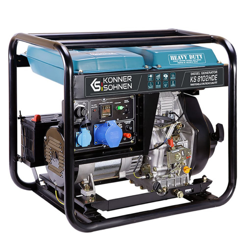 Особливості моделі KS 8102HDE: ФІРМОВІ ДВИГУНИ. Двигуни для дизельних генераторів, так само як і для бензинових, виробляються за ліцензією DIMAX Int. GmbH та маркуються власним тавром з логотипом. У всіх моделях запас потужності двигуна по відношенню до альтернатора дозволяє видавати заявлену напругу та підтримувати його стабільність у повному діапазоні напруг. Усі двигуни проходять тестування тривалою безперервною роботою, а потім розбираються та досліджуються на рахунок виявлення несправностей. Кожний двигун та кожен генератор мають індивідуальний серійний номер, що дозволяє нам контролювати якість виробництва та сервісного обслуговування. Двигуни відповідають усім світовим та європейським стандартам якості та економічності; ЗБІЛЬШЕНИЙ МОТОРЕСУРС ДВИГУНІВ. Дизельні генератори Könner & Söhnen® серії «HEAVY DUTY» мають збільшений моторесурс - тому мають більш тривалий термін служби, можуть працювати більше годин без перерви. Ресурс двигунів досягає 3000 мотогодин, що підтверджується багаторічними багаторівневими тестами та гарантією. Але звісно двигуни показують такі високі показники при правильній експлуатації та проходженні планового технічного обслуговування; ПЕРЕДСТАРТОВИЙ ПІДІГРІВ (PREHEATER). Дизельні генератори серії «HEAVY DUTY» оснащені функцією передстартового підігріву, яка дозволяє запускати генератор у зимову годину без лишнього часу; ЗБІЛЬШЕНА ГАРАНТІЯ. На дизельні генератори серії «HEAVY DUTY» розповсюджується збільшена гарантія — 2 роки або 3000 мотогодин (залежно від того, який факт настане першим) за умови правильної експлуатації та проходження планового технічного обслуговування; УДОБНА ЕРГОНОМІЧНА ПАНЕЛЬ УПРАВЛІННЯ. Зручна ергономічна панель дозволяє легко управляти всім агрегатом і не потребує додаткових навичок. Сучасний багатофункціональний LED-дисплей відображає частоту, вольтаж та кількість відпрацьованих генератором годин. Інформація на дисплеї допомагає легко контролювати якість напруги, що видається пристроєм; AVR. Генератори "Könner & Söhnen" серії "HEAVY DUTY" оснащені інтелектуальною системою стабілізації напруги AVR. Вона дозволяє утримувати вихідну напругу генератора на постійній величині 230В і захищає від небажаного короткого замикання та перенавантаження; ПІДСИЛЕНА РАМА. Завдяки додатковому підсиленню рами верхніми захисними планками, генератор професійної серії HEAVY DUTY може експлуатуватися в більш жорсткому режимі, посилена рамна конструкція додатково захищає від пошкоджень баку при експлуатації та транспортуванні; ГУМОВІ ОПОРІ ДЛЯ ЗАХИСТУ РАМІ. Для всіх моделей дизельних генераторів «Könner & Söhnen» до комплекту входять додаткові гумові опори для захисту рами від корозії. Завдяки опорам, працюючий генератор не пошкодить покриття підлоги, а фарбування рами не буде поцарапане. Також у комплект можна придбати транспортувальний набір; ДОДАТКОВІ АКСЕСУАРИ. Генератор укомплектований додатковими аксесуарами: вилка переносна 2Р+РЕ 16А 230В, силова вилка переносна 2P+Е 230В, 32А, ключ ріжковий, 8×10 мм, ключ ріжковий мм, ключ ріжковий, 17×19 мм, викрутка двостороння 6.0 мм, РН2; Комплектація Konner & Sohnen KS 8102HDE (двигатель EURO II): Дизельний генератор; вилка переносна 2Р + РЕ 16А 230В; силова вилка переносна 2P + Е 230, 32А; ключ ріжковий, 8х10 мм; ключ ріжковий, 12х14 мм; ключ ріжковий, 17х19 мм; викрутка двостороння 6.0 мм, РН2; інструкція по експлуатації; га