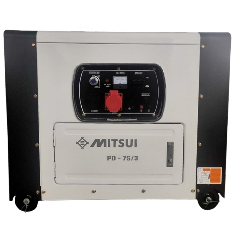 Дизельний генератор Mitsui PD-7S/3 розроблений для стабільної підтримки електроприладів на випадок непередбачених ситуацій – аварій на магістралях, що подають, віялового відключення, стихійних лих. Основні переваги: Трьохфазна станція з номінальною потужністю 6,5 кВт. Дизель-генератор продукує змінний струм на три фази, дозволяючи запитувати побутову техніку, комп'ютери, касові апарати, фермерське та промислове обладнання. Максимально допустима потужність установки 7 кВт розрахована на подолання миттєвих пікових навантажень. Повітряна система охолодження. Вільний приплив повітря через вентиляційні канали нормалізує температуру вузлів, що нагріваються в процесі роботи, не допускаючи критичного нагріву, що призводить до поломок. Синхронний альтернатор. Щітковий агрегат бере участь у перетворенні механічної енергії на електрику з «вирівнюванням» вихідної напруги у вузькому коридорі значень, наближених до 230В. Дозволяє безболісно переносити короткі навантаження під час обслуговування електроінструментів з асинхронним типом двигуна. Електростарт для зручного запуску. Використання електростартера забезпечило безпроблемну активацію силової техніки з малими фізичними зусиллями. Повернути ключ у замку запалення зможуть молоді жінки та літні люди, не вдаючись до допомоги сторонніх. Шумозахисний кожух. Шумоізолююча внутрішня обшивка закритого корпусу ефективно зменшує звуковий тиск, який відчуває людина, завдяки чому не стане причиною дискомфорту в період відпочинку. Комплектація: Дизельний генератор; інструкція; гарантійний талон