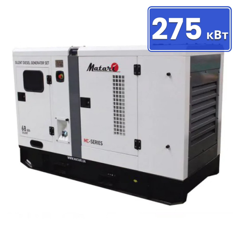 Генератор Matari MC 250 оснащений потужним двигуном (250 кВт), завдяки якому він може забезпечувати енергією великі промислові установки, які не можна відключати при відсутності центрального електропостачання. Використання якісних комплектуючих і надійна збірка всієї конструкції надають агрегату міцність і готовність до активної роботи на довгий час. Особливості MC 250: Наявність підігріву сорочки; віддалений контроль; зручна відкачування масла; рідинне охолодження; всепогодний шумозахисний кожух Комплектація: Рама підстава з високоміцної сталі; дизельний двигун (1500 об / хв); безщітковий генератор змінного струму; електронна панель управління; паливний бак вбудований в раму підставу; Підігрів охолоджуючої рідини; захисні решітки рухомих елементів; промисловий глушник для зниження шуму вихлопних газів; акумуляторна батарея 12/24 V; електростартер; зарядний пристрій; кнопка аварійної зупинки; масло, антифриз 50%; комплект фільтрів; всепогодний шумопоглинаючий кожух; інструкція по експлуатації; гарантійний талон
