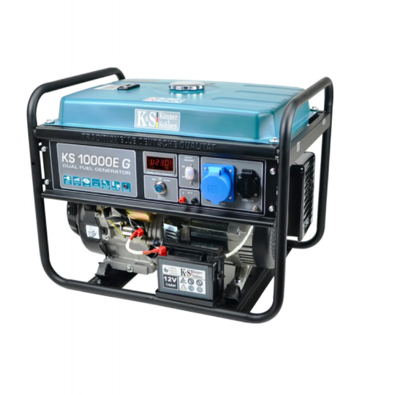 Модель гібридного генератора Konner&Sohnen KS 10000e G забезпечена 4х-тактним двигуном з номінальною потужністю 7,5 кВт, який працює на двох видах палива: бензині і газі (пропан-бутан, природному газі). Підходить для побутового застосування як запасний або аварійне джерело енергії. Паливний бак генератора Konner&Sohnen KS 10000e G об'ємом 25 літрів, дозволяє апарату працювати до 15 годин без дозаправки. Витрата палива при цьому становить: на бензині - від 1,6 л/год. Для перемикання з одного виду палива на інший всього лише потрібно зупинити генератор і переключити заслінку в режим для потрібного виду палива. Konner&Sohnen KS 10000e G виготовлений на спеціалізованому заводі в Німеччині. Завод оснащений сучасною автоматизованою лінією виробництва генераторів з багаторічним досвідом роботи на міжнародному ринку. Особливості KS 10000E G: Дешеве паливо у вигляді природного або скрапленого газу; великий ресурс двигуна, який становить 10-15 тис. мотогодин; не вимагає підвищеної безпеки; низький рівень шуму; виконаний з дотриманням високих стандартів якості заводу Konner&Sohnen Комплектація: Двопаливний генератор; вбудований редуктор; шланг для підключення газового балона (1,5 м); інструкція по експлуатації; гарантійний талон