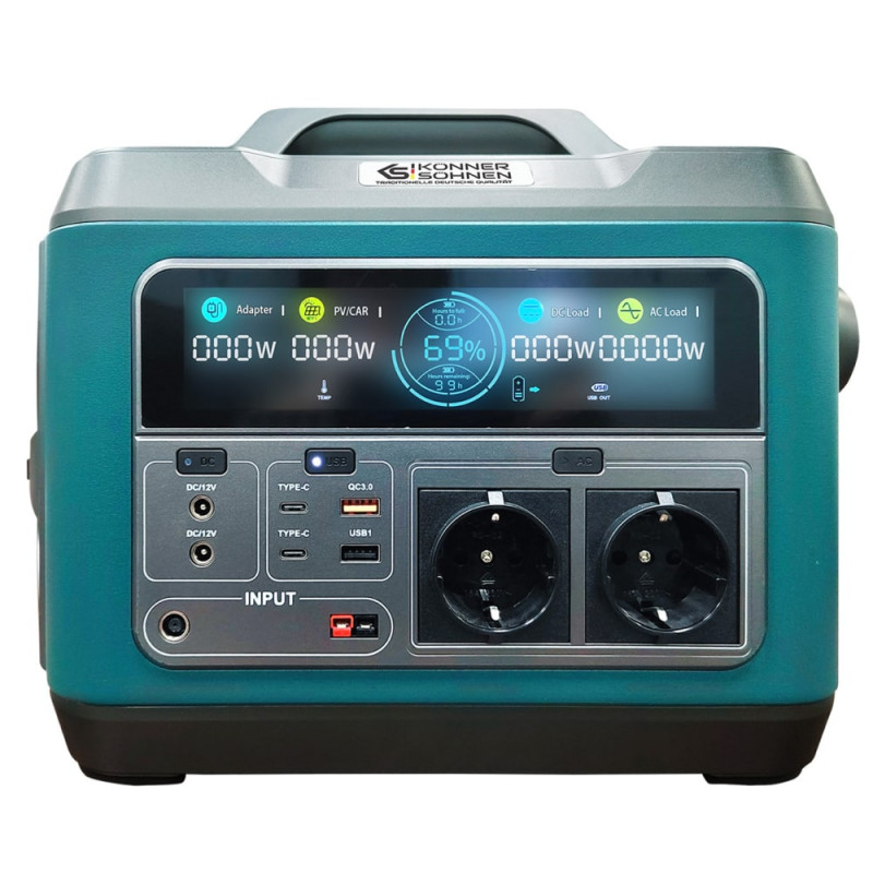Переносна портативна електростанція KS 1200PS-FS німецької торгової марки Könner & Söhnen стане помічником для зарядки пристроїв в дорозі або в разі збоїв електропостачання. Її потужності буде достатньо для роботи такої техніки як смартфон, цифрова камера, планшет, дрон, освітлення, міні-холодильник, ноутбук, насос для накачування коліс/м’ячів, дихальний апарат, телевізор, вентилятор, електричний гайковерт. Вона працює тихо, тому дозволить живити електричні пристрої та насолоджуватись часом без будь-якого заважаючого шуму. Особливості та переваги моделі: ЛІТІЄВИЙ АКУМУЛЯТОР ВИСОКОЇ ЯКОСТІ Портативна електростанція оснащена високоякісними літієвими акумуляторами, які мають велику ємність, але водночас тонкі та легкі, мають тривалий термін служби а також систему контролю батареї (BMS), яка надає багатофункціональний захист: захист від перезаряду, від перенавантаження струму, від перенапруги, від короткого замикання, від перерозряду. ЧИСТА СИНУСОЇДА Чиста синусоїда підходить для чутливих приладів. Всі портативні зарядні станції Könner & Söhnen оснащені технологією Power Delivery, що забезпечує швидке заряджання акумуляторів сучасних смартфонів і навіть ноутбуків. Багатопортова, сумісна з безліччю приладів та включає: 2 порти постійного струму DC, 1 порт змінного струму AC, 1 порт швидкої зарядки USB PD Quick Charge 3.0, порт USB 2.4, 2 порти USB Type-C, що зручно для живлення різноманітних електронних пристроїв. МІЦНИЙ АЛЮМНІЄВИЙ КОРПУС Міцний корпус з посиленої алюмінієвої конструкції забезпечує захист від пошкоджень та має протиударні властивості, гарантує довготривале комфортне використання. Оснащений вбудованим вентилятором для ефективного відведення тепла та максимального охолодження. Має ручку для перенесення забезпечує легке транспортування та розміщення.