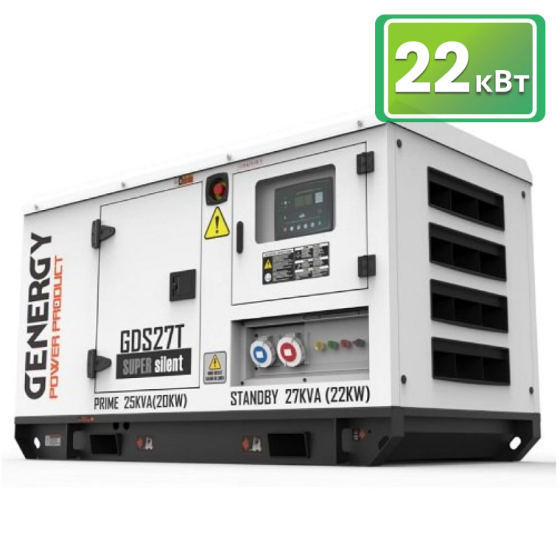 Генератор дизельний GENERGY GDS27T 22 кВт – трифазна 400 В електростанція для підключення потужних побутових приладів, будівельного обладнання. Придатна для використання як основне та резервне джерело електроживлення (є можливість встановлення автоматичного введення резерву). Особливості та переваги моделі GENERGY GDS27T: Максимальна потужність електростанції – 22 кВт (27 кВА) при такому навантаженні допускається використання генератора не більше 1 години з 12 годин та не більше 500 годин на рік. Номінальна потужність (максимальна потужність для безперервного використання) – 20 кВт (25 кВА). Модель оснащена 4-циліндровим (циліндри розташовані в ряд) дизельним двигуном remote signal GENERGY – SDE4100DY з прямим упорскуванням палива, водяним охолодженням. Літраж двигуна – 3298 л. Об'єм олії – 10 л. Об'єм охолоджуючої рідини – 12 л. Генератор SINC184EFX синхронний однофазний самозбудливий, 100% мідна обмотка, ККД – 85,7%. Виконує 1500 об/хв – 4 полюси. Має низькі гармонійні перешкоди та спотворення. Легкий запуск навіть за низьких температур навколишнього середовища: вбудований нагрівач води дозволяє генератору швидко здійснити аварійний запуск у разі раптового припинення подачі електроенергії в центральній мережі (АВР). Наявність передпускового підігрівача повітря дозволяє запустити генератор при екстремально низьких температурах. Наявність контролера DEEP SEA, який відстежує та виводить на екран усі параметри генератора, попереджає про помилки, зупиняє двигун генератора у разі потреби. Акумулятор входить до комплекту постачання. Зарядний пристрій вбудований. Модель оснащена паливним баком на 55 літрів. Показники споживання пального в залежності від навантаження генератора такі: при навантаженні 25% споживання становитиме – 1,73 л/год; при навантаженні 50% споживання становитиме – 3,45 л/год; при навантаженні 75% споживання становитиме – 5,18 л/год; при навантаженні 100% споживання становитиме – 6,9 л/год.