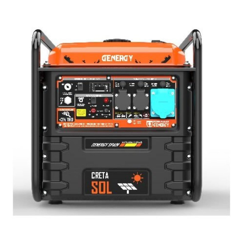 Генератор інверторний бензиновий GENERGY CRETA SOL 7,5 кВт – однофазна 230В електростанція, призначена для забезпечення електроенергією приладів потужністю до 7,2 кВт (номінальна потужність). Максимальна потужність цього бензогенератора – 7,5 кВт. Виділяється серед аналогічних моделей наявністю системи автоматичного включення та відключення через розімкнений контакт для підтримки сонячних або вітрових електростанцій. Особливості та переваги моделі CRETA SOL 7,5 кВт: Модель оснащена фірмовим чотиритактним бензиновим двигуном OHV з примусовим повітряним охолодженням GENERGY SGB460PRO EURO V об'ємом 459 см3. Об'єм олії – 1,1 л. Альтернатор інверторний, завдяки чому до GENERGY CRETA SOL можна підключати чутливу до перепадів напруги цифрову техніку. Наявність захисту від низького рівня масла, перевантаження та короткого замикання. Легкий ручний запуск та електрозапуск – запускає генератор поворотом ключа (акумулятор входить у комплект поставки). Також запуск виконує система – автоматично вмикає роботу генератора при відключенні подачі електроенергії від сонячної/ветрової електростанції. Після відновлення подачі екоенергії - генератор автоматично відключається. Послідовність запуску в режимі автоматичного запуску – до 5 спроб. На панелі керування знаходяться розетки 2х16А 230 В (IP44), 1х32А 230 В (IP44) та розетка постійного струму 1х12 В для заряджання акумуляторів. Затримка вихідної потужності – для захисту підключеної техніки від подачі нестабільного струму під час запуску. Компактні габарити (порівняно з аналогами): 634х545х566 мм. Модель на 30% важить менше за аналоги з такою ж потужністю - всього 70 кг. Комплектація: Генератор інверторний; інструкція з експлуатації; гарантійний талон; картонна коробка
